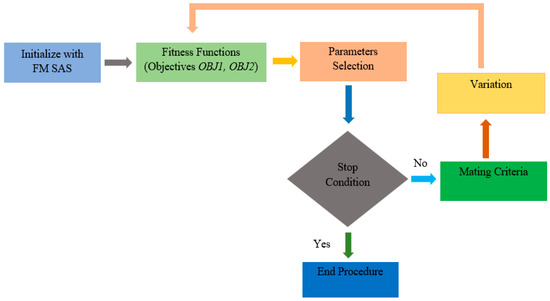 Figure 3 shows the SPEA2 algorithm workflow according to our proposed problem with two objectives (cost and time) that need to be optimized. First of all, the proposed procedure is initialized with a large configurable SAS. Then, the two objectives’ fitness functions are defined. These fitness functions use parameter values, and these values are mentioned in Section 4. The procedure works until optimized results are generated. However, if the stop condition is not fulfilled, then the procedure goes back to the mating criteria and variation process, and these values are given to fitness functions, and the remaining procedure works in the same manner to generate results.