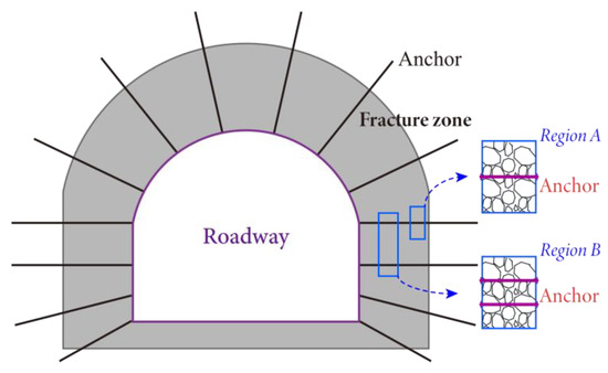 In the actual project, due to the influence of primary joints, fissures, and other structural surfaces and weathering and erosion, the surface of the roadways of the soft surrounding rock was highly fragmented, forming irregular bulk block structures of different sizes [36,37]. The surrounding rock had large deformation and strong rheological properties. The bearing capacity and anchoring mechanical behavior of this fractured rock mass were significantly different compared with the intact rock mass [38]. Throughout the literature at home and abroad, experimental studies on the relationship between the degree of surrounding rock fragmentation and the adaptability of anchor support are rarely reported. In view of this, this study, through the development of model-similar materials and a specialized anchor addition scheme, carried out compression tests on the model specimens of similar materials under the action of anchor anchoring to investigate the influence law of aggregate particle size and anchor anchoring method on the strength, deformation, and fracture characteristics of the specimens. And the reinforcing effect of the anchor rods on the soft and broken surrounding rock was analyzed by numerical simulation.