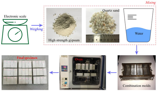 Considering the comparability of the test results, it is recommended to use gypsum and quartz sand as the raw materials to configure the specimens [39]. The specimen size was set to 50 mm × 50 mm × 100 mm with reference to the international standards of rock mechanical testing and the results of previous research [40,41,42,43], where gypsum was used as a binder [44]. In order to simulate the large number of fissures and other structural surfaces that exist in the rock mass, three kinds of quartz sand with different grain sizes (Grain size A: 2–4 mm, Grain size B: 4–8 mm, and Grain size C: 10–15 mm) of quartz sand as the aggregate were used (Figure 2). The specimens containing quartz sand and gypsum with different grain sizes were used to simulate rock bodies with different degrees of microfractures and structural surfaces. The smaller grain sizes of quartz sand and gypsum had smaller contact surfaces, forming structural surfaces of smaller sizes inside the specimens, and vice versa.