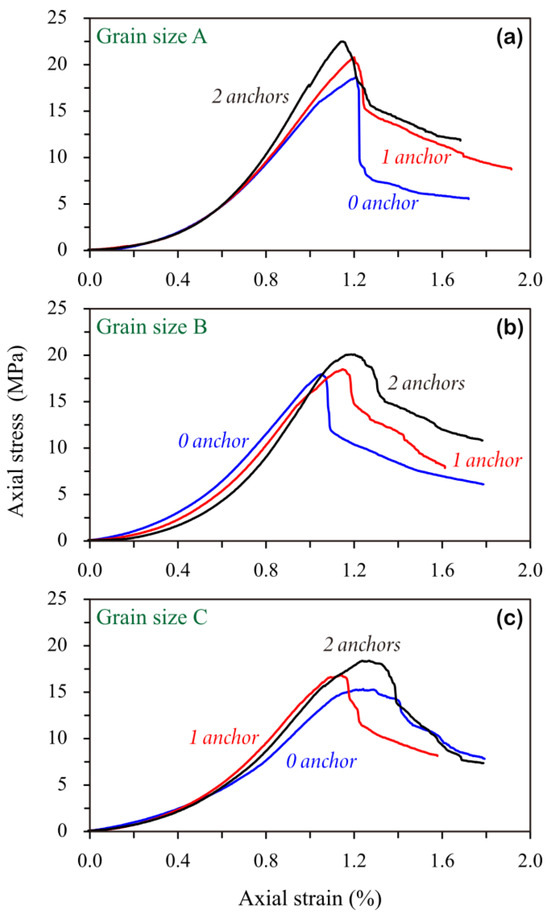 The axial stress–strain curves during uniaxial compression of the specimens with different grain sizes are shown in Figure 6. Compared with the unanchored specimen, it can be seen that the residual strength value of the anchored specimen in the late stage of damage had a greater increase, but the residual strength value in the compression process of the 2–4 mm grain size aggregate specimen was higher than that of the 4–8 mm and 10–15 mm grain size aggregate specimens. Consequently, the trend of the stress–strain curves of the larger aggregate specimens close to the horizontal direction was more obvious. This indicates that under uniaxial compression conditions, anchors can increase the compressive strength and elastic modulus of specimens. They can also improve the residual strength of the rock mass, but the ability of the anchor bar to improve the residual strength of the rock mass gradually decreases with the increase in the specimen crushing degree.