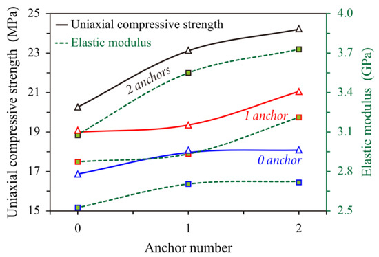 - The anchoring effect of the anchors on the specimens with different grain sizes varies was crucial. When different anchoring methods are used for the specimens with the different grain sizes of the aggregates, the uniaxial compressive strength and elastic modulus of the specimens follow the following pattern: no anchor<single anchor<double anchor. With the increase in the specimen aggregate size, the degree of improvement of the mechanical properties of the specimens by the anchors decreases gradually.