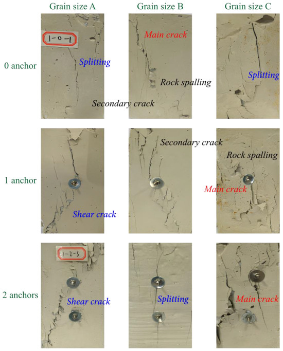 The final damage pattern of the rock mass under the conditions of different grain sizes and anchoring methods is shown in Figure 8. As can be seen from the graph,