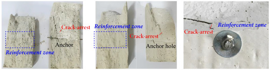 The anchoring effect of the anchor on the specimen was reflected in the two aspects of reinforcement and crack stopping. Under the prestressing reinforcement of the anchor, when the crack developed into the reinforcement range of the anchor, the anchor played the role of stopping the crack from developing or changing its direction. The action of the tray exerting force along the axial direction of the anchor rods created a conical stress concentration within the rock mass in contact with the tray, which acted as a reinforcement to the rock mass. As shown in Figure 9, after the rupture of the specimen, an obvious reinforcement zone was formed at the anchor reinforcement, and this extrusion reinforcement effect improved the integrity and bearing capacity of the rock mass.