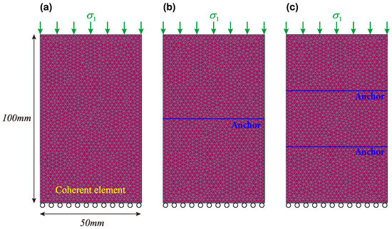In order to further analyze the protective effect of the anchor rods on the rock, this paper used the finite element software ABAQUS [45,46,47] to establish a numerical model of uniaxial compression of the rock. The boundary conditions of the model were similar to the boundary conditions of the test, and the bottom boundary of the model was fixed to the vertical displacement, and the top boundary gradually applied the axial load. The test was divided into three cases: (1) no anchor; (2) embedded 1 anchor; (3) embedded 2 anchors (Figure 10). In the model, cohesive units were inserted between the rock units based on the damage mechanics theory. The rock matrix material parameters were a modulus of elasticity of 10 GPa, a Poisson’s ratio of 0.25, and a density of 1700 kg/m3. The cohesive unit adopted the traction-separation theorem, the fracture energy of the unit was 0.1 N/mm, and it was assumed that there is no friction on the contact surface once the unit is cracked. The anchor material parameters were a modulus of elasticity of 210 GPa and a Poisson’s ratio of 0.3.