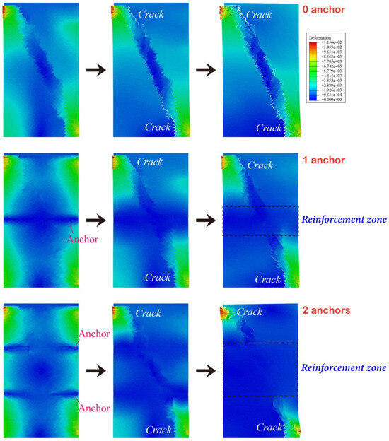 Figure 11 shows the evolution of rock deformation and damage under the different working conditions. For the no-anchor condition (0 anchor), the specimen showed typical oblique shear damage characteristics, and at the same time, in the region near the top and bottom boundaries, a block spalling phenomenon occurred, and with the continuous increase in the axial load, the main macroscopic rupture surface running through the specimen was presented eventually. Under the single-anchor action (1 anchor), the deformation of the specimen near the anchor was significantly lower than that in other areas due to the limiting effect of the anchor. At the same time, the main rupture surface of the rock was blocked, and it can be seen from the figure that an obvious reinforcement zone was formed near the anchor. Under the condition of double anchors (2 anchors), the restriction effect of anchors was more obvious, the range of strengthened area was wider, and the rock rupture surface was strongly blocked. This indicates that the anchors played a reinforcing and fracture stopping role on the rock, and the more anchors (or the more intensive) meant a more obvious reinforcing effect.