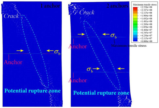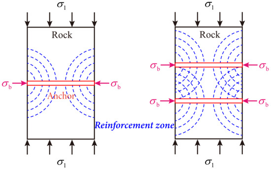 Figure 13 shows a schematic diagram of the reinforcing action of the anchor rods, from which it can be seen that the anchor rods limited the deformation of the specimen and formed an anchor support anchorage force, similar to a small lateral circumferential pressure. In the area of anchor cementation and action, a reinforcement zone was formed, which can greatly limit the development of internal cracks as well as the lateral expansion of the rock and provide protection to the specimen. Compared with the limited scope of the reinforced zone under the single-anchor condition, the reinforced zone under the double-anchor condition had a wider scope, and there was a superposition effect, which effectively strengthened the bonding effect of the anchor and the rock body. This, as a result, gave a better supporting effect to the anchor, which greatly alleviated the rock’s rupture development, effectively harmonized its overall deformation, and played a key role in stabilizing it.
