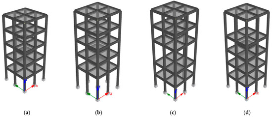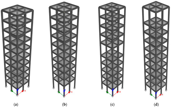 Ten-story models: (a) M10ref, (b) M10bs5, (c) M10ms5, and (d) M10ts5.