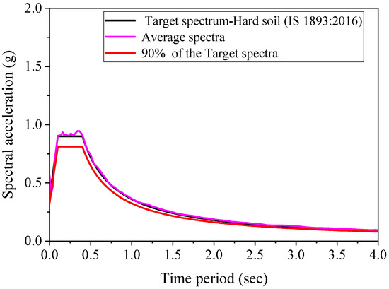 Realistic responses in the seismic reaction evaluation technique are produced using actual ground motion data [66,67]. The current study incorporated 11 horizontal ground motion excitations for hard soil types, which were obtained from the freely available NGA-West2 Database, PEER [68]. These ground motion recordings were selected in accordance with the guidelines outlined in ASCE 7–16 [33]. The NEHRP [34] site categorization scheme states that excitations are decided by referring to shear wave velocity (VS30) to indicate hard soil. Table 2 displays the specifics of the excitations. For this investigation, ground motions compatible with the design spectrum were chosen, since they can significantly save computational time [69]. In order to generate seismic excitations that are compatible with the spectral characteristics of the desired response spectrum, the time domain spectral matching method proposed by reference [70] is utilized.
