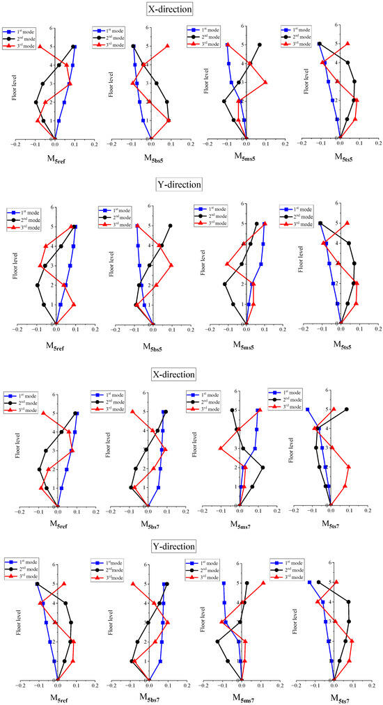 The inclusion of a middle soft story in building models significantly affects the peak floor spectral acceleration directly below the soft story (second floor in five-story models and fifth floor in ten-story models). In the X direction, the of the second floor in model M5ms5 is decreased by 42.8% for the first modal period, and increased by 89.7% for the second modal period compared to M5ref. In the M10ms5 configuration, the of the fifth floor, associated with the second modal period, increases by 21.6% compared to M10ref. Hence, for buildings with a middle soft story, it is recommended to add a component matching the first modal period’s vibration to floors underneath the soft story, as the first mode of vibration has minimal impact.