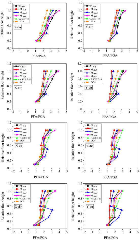 Figure 7 and Figure 8 display the relationship between the vibration period of a non-structural component ( in seconds) and the peak spectral acceleration ( in ) of the floor. When the FRS is plotted throughout a wide variety of periods, maximum spectrum peaks should appear at the fundamental natural period of the supporting structure [73]. FRS peaks align with the typical periods of relevant building models. In all considered models, spectral accelerations are higher in the X direction for the first modal period. Increasing the soft-story height (from 5 m to 7 m) decreases FRS amplitudes across all floor levels. In all the models, the FRS intensity decreases from the upper fifth story to the lower first level. The soft story’s presence and location have a notable impact on the FRS, as evident from the FRS curves depicted in Figure 7 and Figure 8. In a M5ref, the FRS exhibits two peaks corresponding to the first and second modal periods for the first and second floor levels. The impact of the higher mode is negligible for the higher floors (third, fourth, and fifth). This observation aligns with previous research findings [16]. Peak spectral acceleration related to the higher modes increases with increasing building height (ten-story reference building). Up to the third floor, the second and thirds modes significantly influence the peaks of FRSs, whereas the higher mode’s contribution has less of an impact as the floor levels increase. This observation confirms the findings of Vukobratovi’c and Ruggieri [19]. Consequently, it can be deduced that, in the absence of vertical stiffness irregularities, short-period NSCs located in the lower floors of a building would experience significant earthquake forces.