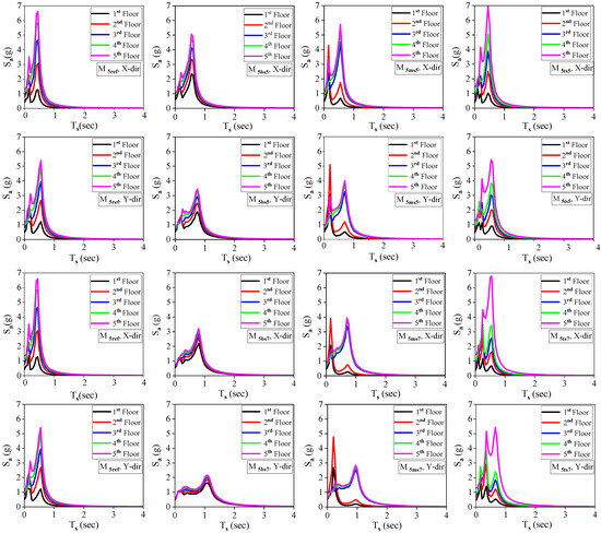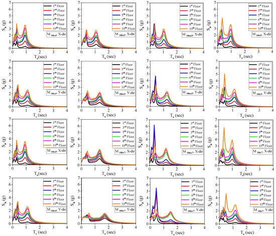 This section and the results presented here are based on past research [72], and they have been reproduced here to enhance readability and facilitate comprehension for the readers. The considered NSCs are elastic single degree of freedom (SDOF) systems with masses much smaller than the supporting structure. They have a single attachment point to the floor, and the dynamic interaction effects with the structure can be disregarded. The FRS technique decouples and independently assesses NSCs and structure in a predefined manner. For NSCs to create the appropriate FRSs, absolute acceleration data are collected from each floor’s model separately. The floor response spectra for each of the models taken into consideration were derived in the manner that was previously indicated. For each ground motion, the acceleration response is recorded at multiple floor levels to obtain FRSs. The mean findings are displayed for each floor and were achieved at a damping ratio of 5%.