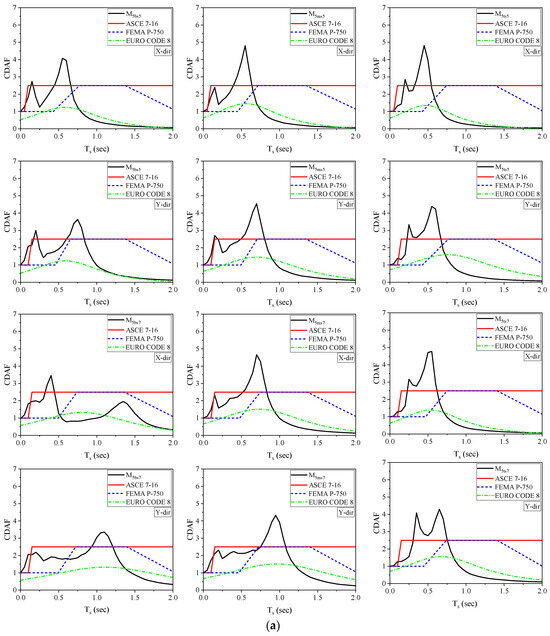 In medium soft-story buildings, the amplification factor ranges from 3.55 to 4.92, correlating with the NSCs’ fundamental vibration period. For bottom-soft-story models, the amplification factors range from 1.37 to 4.07, while top-soft-story models have values between 2.69 and 4.79. Overall, buildings with a soft story at the middle floor experience the highest amplification in the acceleration of the NSC. Figure 9 shows that the CDAF deviates from the definitions provided in FEMA P-750, ASCE 7, and Eurocode 8. This disparity becomes more noticeable as the time periods approach the vibration periods of the building models under investigation.