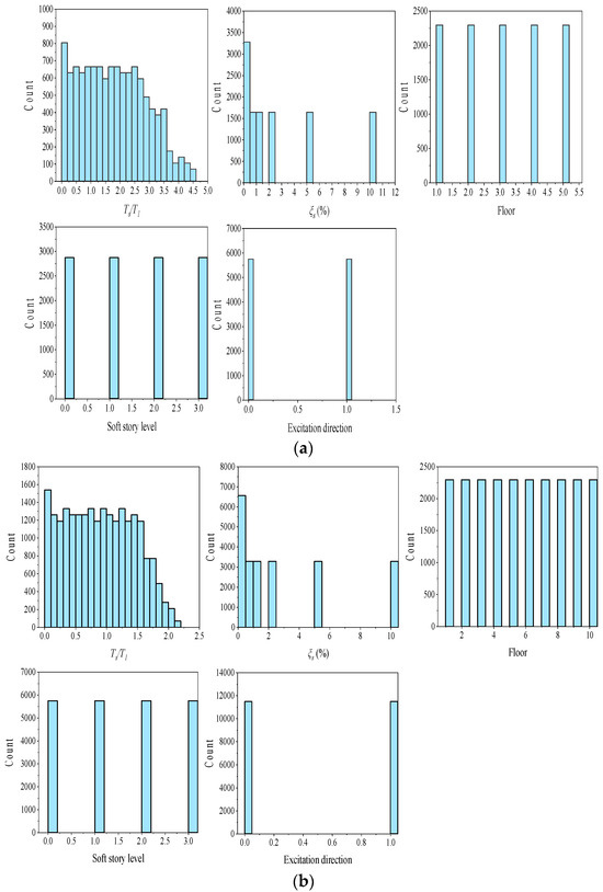 Distribution of the input parameters generated for the dataset from (a) five- and (b) ten-story models.