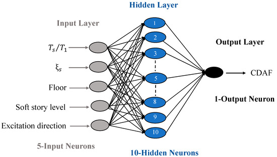 This section outlines the methodology to be adhered to for the construction of the predictive model. To train the hidden neurons, an appropriate learning technique must be created. The network is trained using the Levenberg–Marquardt (LM) variant of the backpropagation (BP) method. The neural network model for this study utilized the tan–sigmoid transfer function in the output and hidden layers. MATLAB R2019b was employed as the environment for developing and training the network, offering the essential tools and capabilities. In total, a dataset of 11,480 CDAF values were simulated for the five-story building models (M5ref, M5bs5, M5ms5, and M5ts5) in this study, corresponding to 41 non-structural component vibration periods, seven damping ratios, two excitation directions (where 0 and 1 are assigned to two orthogonal directions (X and Y), respectively), four soft-story conditions (where 0, 1, 2, and 3 are assigned to the reference, bottom, middle, and top soft-story models, respectively), and five-floor levels. Similarly, a dataset of 22,960 CDAF values were simulated for the ten-story building models (M10ref, M10bs5, M10ms5, and M10ts5) corresponding to 41 non-structural component vibration periods, seven damping ratios, two excitation directions (where 0 and 1 are assigned to two orthogonal directions, respectively), four soft-story conditions (where 0, 1, 2, and 3 are assigned to the reference, bottom, middle, and top soft-story building models, respectively), and ten-floor levels. The soft-story height is limited to only 5 m for the development of prediction models. To ensure the proper training and evaluation of the neural network model, each dataset is divided into three subsets: a training set comprising 70% of the entire dataset, a validation set comprising 15%, and a testing set comprising the remaining 15%. Prior to training, the entire dataset undergoes preprocessing. This involves normalizing the dataset to ensure that all variables are scaled between −1.0 and 1.0, thus providing equal weighting to each variable in the analysis. Such normalization can be carried out using Equation (3).