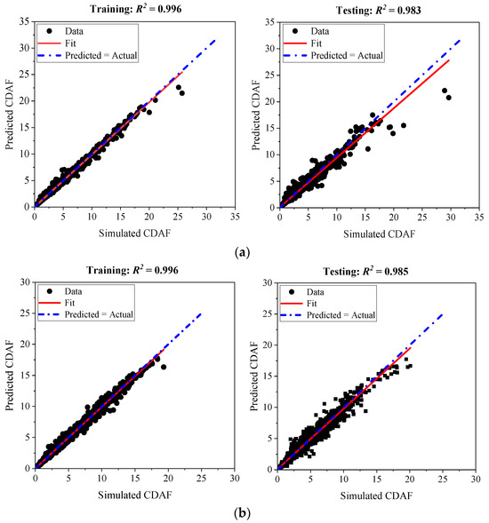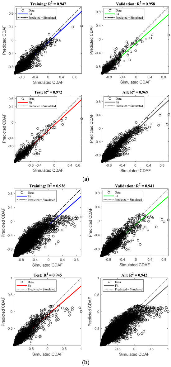 and are the simulated and predicted outputs, is mean of the simulated outputs, and is the number of data points. Table 12 displays the outcomes of the model’s performance. For the five- and ten-story building models, Figure 13 displays the relationship between the predicted and simulated CDAFs. The model provides accurate predictions of the CDAF values, as evidenced by the high correlation coefficient approaching unity.