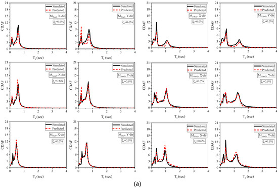 This study aimed to evaluate the effectiveness of a neural network model in predicting the dynamic amplification factors of NSCs connected to building models with varying soft-story levels. To validate the model, CDAF spectra were constructed using damping ratios of NSCs (0.6% and 7%) for the soft-story floor levels in the building models under investigation. During the creation of the ANN prediction models, the damping ratio values chosen for validation are not incorporated. The soft-story floor levels of the five- and ten-story building models’ simulated and predicted CDAF spectra are shown in Figure 14. The comparison between the predicted and simulated spectra indicates a significant level of agreement across all investigated instances.