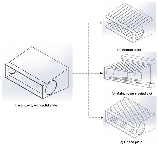 The experimental study was conducted on a certain type of chemical reaction experimental platform, and the upper and lower wall panels of the optical cavity were designed to be removed to replace the experimental parts, as shown in Figure 3. In the experimental study, three different boundary layer control experiments were designed, that is, three different types of upper and lower wall panels of the optical cavity: a slotted plate, a mainstream ejection slot, and an orifice plate.