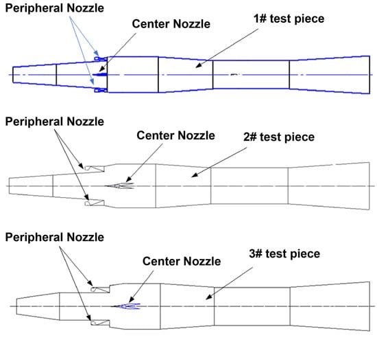 As shown in Figure 4, the isolation section of test piece 1# is an expanded type, and all nozzle exits are in the same section. The isolation section of experiment 2# is also an expanded type, but it is arranged by moving the center nozzle back to ensure that its front end is located at the exit position of the peripheral nozzle. The isolation section of the 3# test piece is flat, and the center nozzle is moved back to ensure that its front end is located at the exit position of the peripheral nozzle. The rear edge of the nozzle 3# test nozzle is slotted to enhance mixing. The active gas parameters are listed in Table 2.