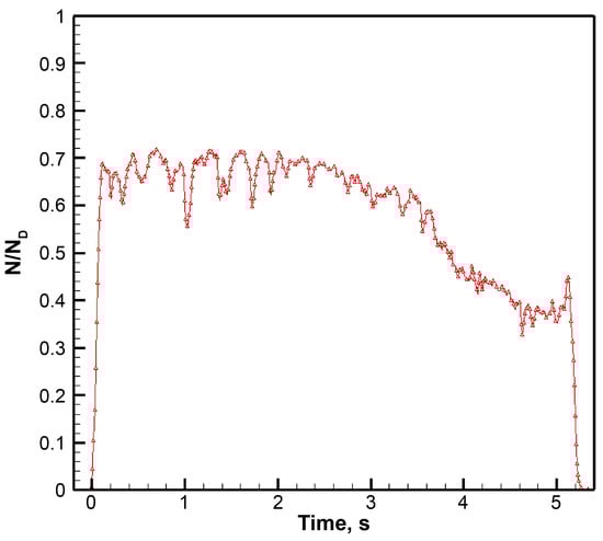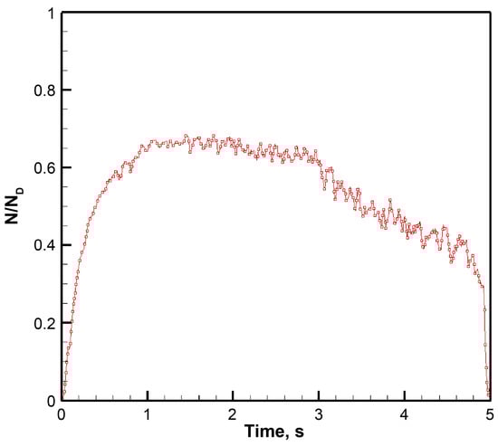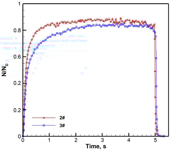 Figure 6 shows the power curve of the extracted energy when the chemical reaction platform operates independently, where ND is the designed reaction energy power of the platform. The figure shows that the energy power increases continuously within 0–1 s and reaches its maximum value. Within 1–3 s, the energy power decreased, and there was a small fluctuation; within 3–5 s, the energy power decline is more apparent, and the amplitude of the fluctuation becomes larger. The state of the airflow in the optical cavity was an important factor affecting the chemical reaction. During the energy extraction process, the increasing pressure in the optical cavity was the main reason for the decrease in energy power. In addition, owing to the thickening of the boundary layer in the optical cavity, the disturbance of the airflow in the optical cavity also increases, increasing the fluctuation of the power curve. The results when the SCRP works independently demonstrated that the ability of the SCRP to resist back pressure and airflow disturbances was weak when it was directly connected to the vacuum tank.
