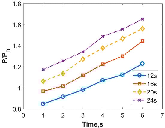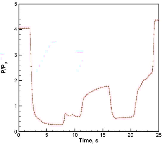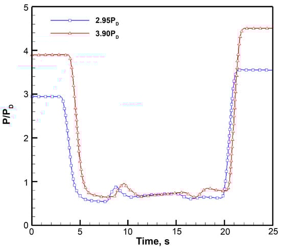 Figure 5 shows the change curve of the optical cavity pressure with time during the SCRP operation with a solid plate. The pressure in the optical cavity gradually increased with time during the energy discharge. The PD in the figure represents the design pressure of the optical cavity, and the initial back pressure was approximately 1.25 PD. When the SCRP was in the early stage of operation, the pressure of the optical cavity was sharply dropped to approximately 0.6 PD, and a supersonic flow field in line with expectations was established. As the experiment progressed, the back pressure increased gradually, pushing the shock wave structure in the SCRP airflow channel upstream, while the heat released by the chemical reaction accumulated in the channel, increasing the temperature of the air stream. The reasons for this were that the air velocity in the optical cavity decreased, the pressure increased, the supersonic flow field in the optical cavity was destroyed, and the operating state of the SCRP was affected. If the pressure in the optical cavity is excessively high, it can cause the chemical reaction platform to malfunction. Therefore, during the operation of the chemical reaction platform, a continuous increase in pressure in the optical cavity was not conducive to the long-term operation of the platform. There were two reasons for the continuous increase in the pressure in the optical cavity. First, the volume of the vacuum tank is limited. As the experiment progressed, the pressure in the vacuum tank continued to increase, which increased the inverse pressure gradient in the airflow channel, thickened the boundary layer, and forced the flow field structure to move upstream, increasing the pressure in the optical cavity. Second, part of the energy generated by the non-residual chemical reaction was converted into the internal energy of the air stream, which increased the pressure in the optical cavity.