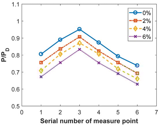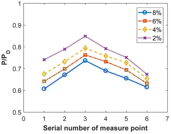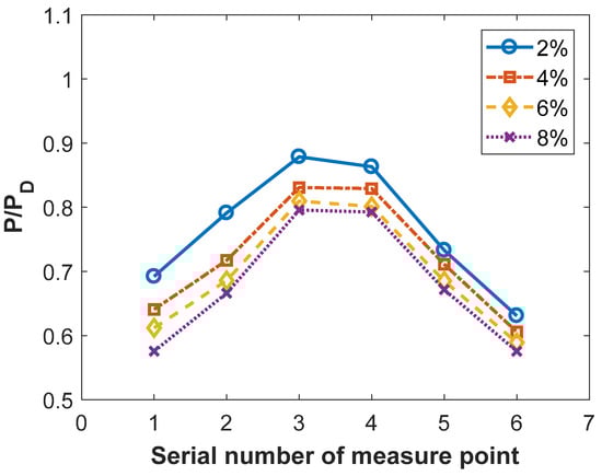 Table 3 lists the chemical reaction platform power at different pumping rates, where ND is the design power. Within 2–8% units, the power increases with an increase in the pumping volume. When the pumping capacity continued to increase to 6%, the power began to decrease. This demonstrates that the boundary layer control effect was more apparent when the pumping volume was properly increased within a small range; however, if the pumping volume exceeds a certain threshold, the chemical reaction platform power will be affected by the reduction in effective airflow.