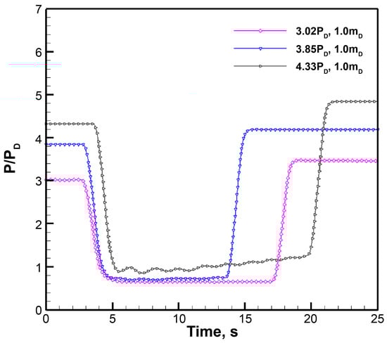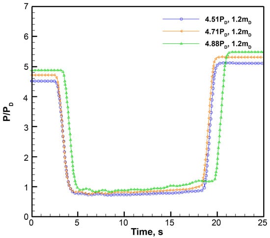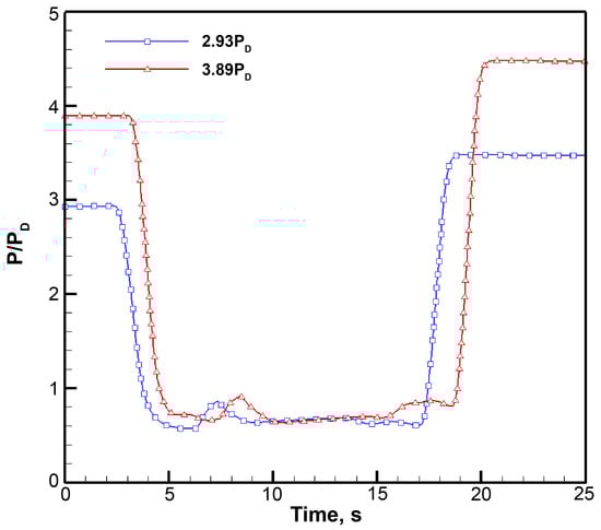 Figure 11 and Figure 12 show the performance debugging test results for supersonic diffuser test piece 3#, where mD is the design flow rate of the diffuser. The diffuser’s active airflow is the design flow. When the initial pressure of the vacuum tank was not higher than 4.0 PD, the diffuser could start smoothly, and the pressure of the optical cavity was maintained within the range of the reaction requirements. When the initial pressure of the vacuum tank was increased to 4.33 PD, although the diffuser could be started, the pressure in the optical cavity fluctuated significantly and increased gradually with time, indicating that the diffuser could no longer maintain the pressure in the optical cavity within the required reaction range. When the flow rate of the active gas was increased by 1.2 times the design flow rate, the diffuser could maintain the pressure of the optical cavity within the required range under the initial back pressure of the vacuum tank at 4.71 PD, and the cavity pressure exhibited a slight upward trend. If the initial back pressure of the vacuum tank continued to increase to 4.88 PD, it became difficult for the diffuser to maintain the pressure in the optical cavity within the required range.