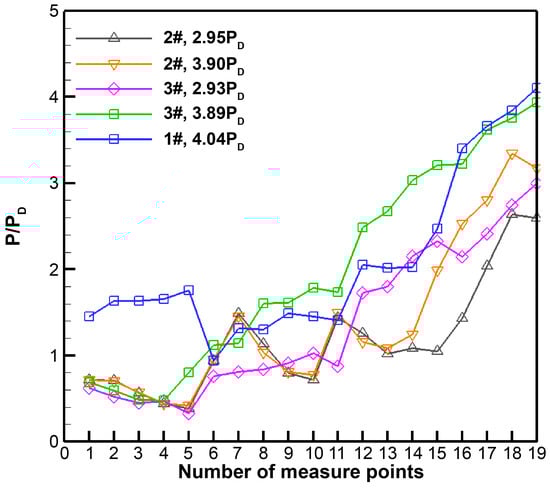 Figure 18 shows the wall pressure distribution curves of the optical cavity and test pieces 1#, 2#, and 3# in the butt joint experiment, where the first five measuring points were located on the optical cavity and the rest were located on the active supercharging supersonic diffuser. The results in the figure show that both diffuser 2# and diffuser 3# started smoothly, and the pressure of several measurement points in the frontmost optical cavity had a downward trend, whereas the pressure distribution in the optical cavity of experiment 1# was significantly high, which once again indicated that the airflow blockage phenomenon of experiment 1# was effectively addressed in experiments 2# and 3#.