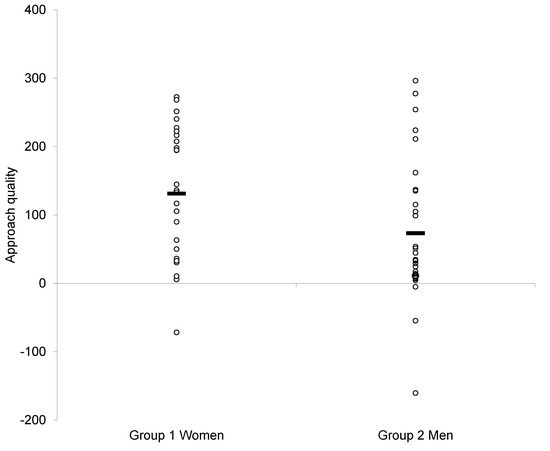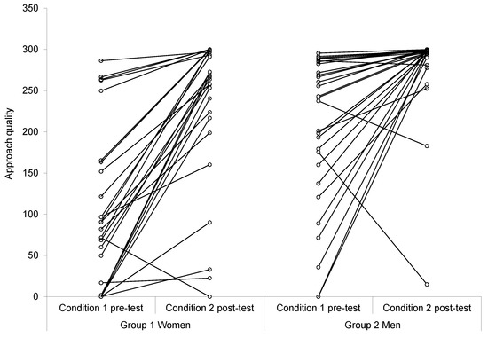 As Figure 3 shows, in pre-test the approach quality was better in men (M = 220.20, SE = 15.59) than in women (M = 97.37, SE = 16.83), but in post-test smaller differences were found between women (M = 244.84, SE = 13.53) and men (M = 278.88, SE = 12.54). Also as illustrated in Figure 4, the improvement of the approach quality in post-test as compared to pre-test was larger in women than in men.
