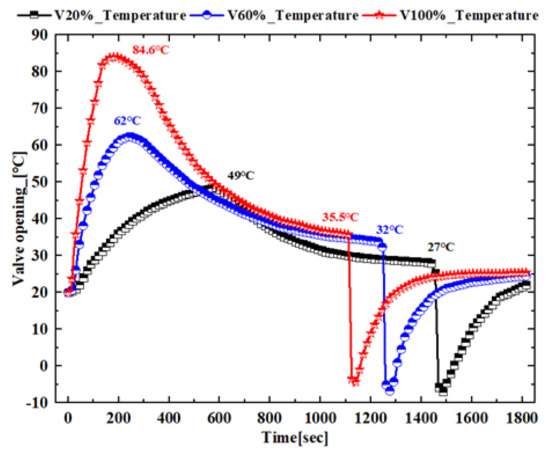 Figure 5, the temperature increased up to 49 °C, 62 °C, and 84 °C, respectively, at valve openings of 20%, 60%, and 100%. The reason for the higher temperature increases is that the pressure is compressed in a vessel when helium gas is charged into it, and the gas is delivered rapidly as the valve opening changes during the charging process.