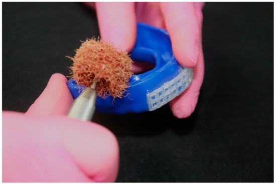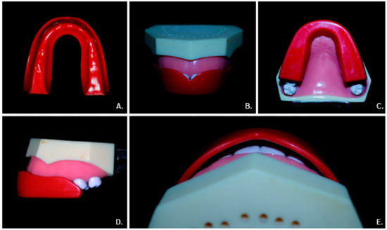 This type of mouthguard, typically made of thermoplastic materials, is the most commonly used protective device among athletes [8]. The prescribed procedure for athletes involves immersing these mouthguards in boiling water and softening the material until it becomes malleable. Subsequently, individuals bite, suck, and modify the mouthguard with their tongue and fingers to ensure a proper fit [26], as illustrated in Figure 2. However, this adaptation method is prone to misfits and variations in thickness depending on the force applied to each area by the fingers. Moreover, it may not cover all the necessary regions for protection due to the limited available size options, particularly when it comes to extending coverage to the posterior teeth [4,31]. Moreover, it is important to consider that the forming process of these mouthguards can lead to a reduction in material thickness of around 70 to 99%, depending on the user’s technique. This lack of control over the fitting process can compromise the protective capabilities of this type of mouthguard [8].