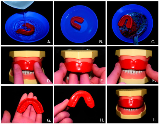 (A) Boil and bite mouthguard inserted into boiling water. (B) Plasticization procedure of the mouthguard in a few minutes. (C) Removal process of the mouthguard from boiling water after plasticization. (D–F) Adaptation procedure of the mouthguard in the mouth. (G–I) Final result.