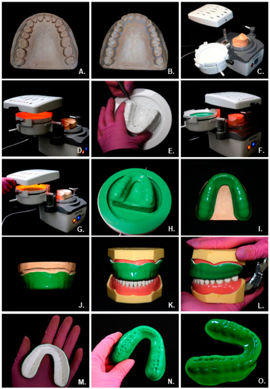 (A) Obtaining the plaster model. (B) Relieving undercut areas with silicone. (C) Positioning of the first layer of the EVA 3 mm plate at Plastpress Machine (Bio-art Intelligent Solutions, Sao Carlos, Sao Paulo, Brazil) to perform the vacuum plasticization procedure. (D) EVA plate heating for plasticization. (E) Delimitation of the mouthguard limit areas. (F) Heating the first layer of EVA is already plasticized to allow adhesion with the second. (G) Plasticization of the second 3 mm EVA sheet. (H) Obtaining EVA plates after the vacuum plasticization process. (I) Occlusal view of the final mouthguard. (J) Frontal view of the mouthguard on the plaster model. (K) Mouthguard on the typodont model. (L) The lateral view of the mouthguard shows the correct adaptation. (M–O) The final result of the custom-made mouthguard with occlusal registration.