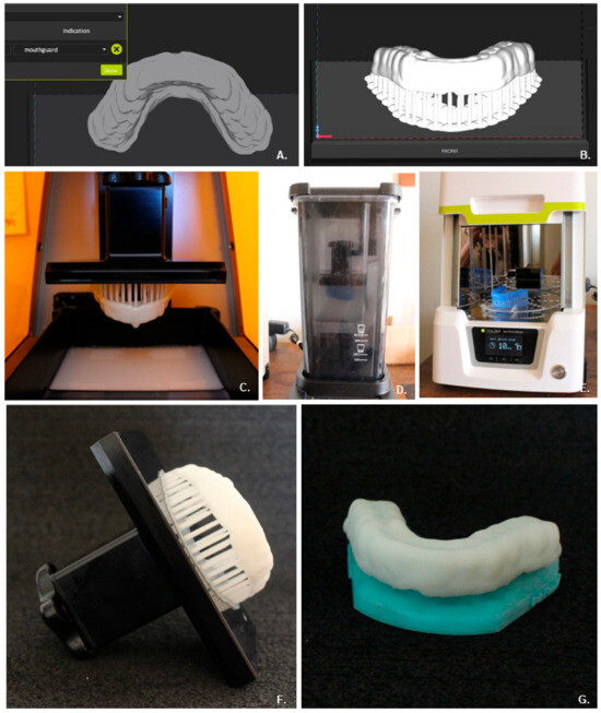 Steps for fabrication of a 3D-printed mouthguard. (A) Imported file after individualized case planning. (B) File placement for 3D printing. (C) The 3D printing process in Dima print mouthguard resin using a Cara 3D printer (Kulzer & Co. GmbH, Wehrheim, Germany), following manufacturer’s recommendations. (D) Washing process in isopropyl alcohol following printing. (E) Cure processing. (F,G) The mouthguard after completing all manufacturing procedures.