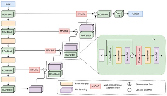 As shown in Figure 1, the RMAU-Net is structured as a U-shaped encoder–decoder network. In the encoder stage, the input image has dimensions of 256 × 256 × 3. After undergoing five RDw operations and four Patch Merging operations, the output size is adjusted to 16 × 16 × 1024. In the decoder stage, the process begins with an up-sampling operation, which reduces the number of channels by half while doubling the resolution. Subsequently, the features from the MCAG module are fused with the up-sampled features in the channel dimension, facilitating precise localization of breast lesions. This fusion is repeated four times through consecutive up-sampling layers, ultimately restoring the feature map to its original size. Finally, the output is fed into a softmax layer for binarization, producing the breast lesion segmentation results.