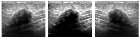 The dataset was split into 80% for training and 20% for validation. During the data preprocessing stage, we resized all images to a 256 × 256 resolution. To address the sample imbalance between benign and malignant tumor data, we applied data augmentation techniques specifically to the tumor samples. This augmentation involved contrast stretching and flipping operations. You can see the results of the data augmentation for breast tumor ultrasound in the Figure 5.