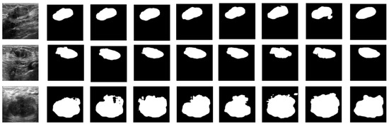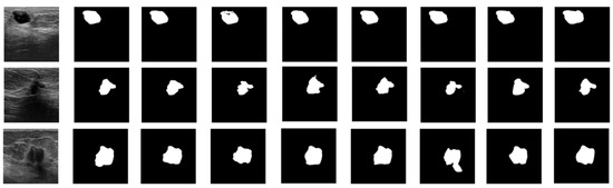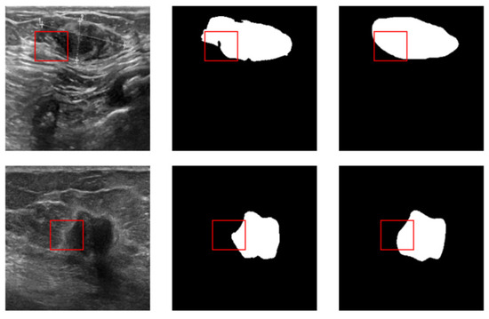 In this paper, five commonly used segmentation metrics are used to evaluate the effectiveness of different methods for the segmentation of breast lesions; they are Dice, IoU, recall, precision, and accuracy. IoU and Dice are the two most important indexes of the image segmentation task. Recall refers to the proportion of all foreground pixels in the ground truth that are correctly segmented as the foreground by the model, precision refers to the proportion of pixels in the segmentation result that are correctly segmented as foreground, and accuracy refers to the proportion of pixels in the segmentation result that are correctly segmented as foreground or hard ground.