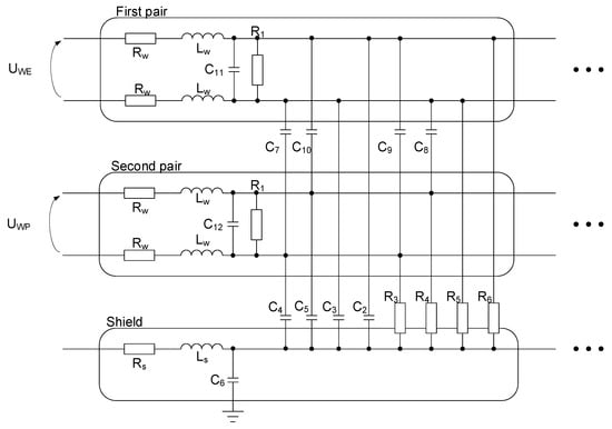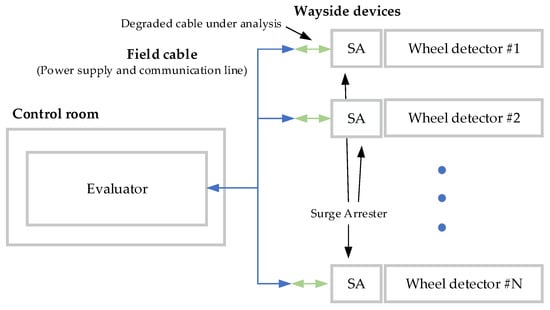 Furthermore, the impact of cable insulator degradation [,,] on the critical parameters, maximum voltage values, maximum current values, and average and maximum power of the protection module for the components remains unknown, but this phenomenon is present in the railway environment due to the need to ensure the long life of the equipment and therefore it needs to be examined. The input data representing the model (Figure 1) and the parameters of the degraded cable are described in detail in ref. [].