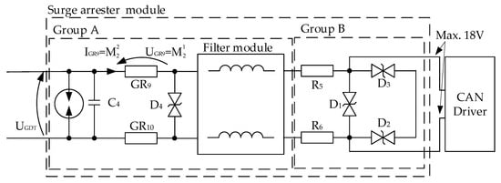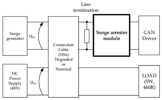 The CAN interface allows for the connection of multiple devices to the bus and thus contributes to lower installation costs. However, it requires an adequate degree of protection against disturbances occurring in the railway environment. In addition, due to the limited space in the trackside area, the surge arrester must have small dimensions, so there is a justified need to design a dedicated method to meet all requirements. The following test environment (Figure 4) was proposed to verify the performance of the surge arrester.
