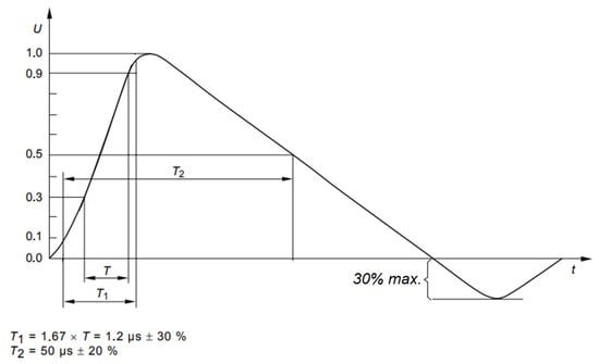 A detailed discussion of the signal shape in the time domain and the required response time of the analyzed circuit is presented in ref. []. Based on this, the time of surge arrester behavior verification was set to 300 µs.