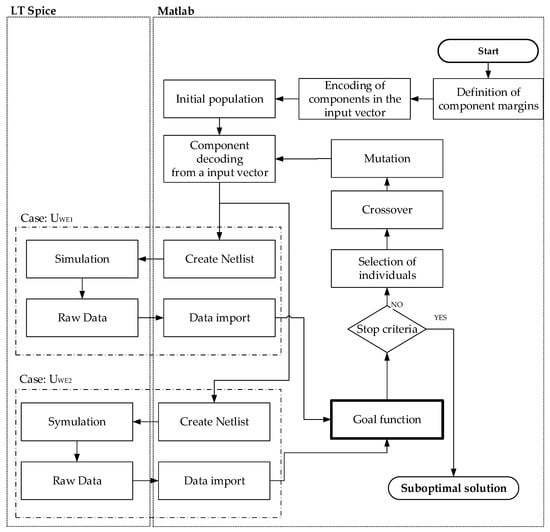 Several artificial algorithms can be used to provide the most optimal solution to the problem at hand, but due to specific circumstances, only one of them was selected. Since simulated annealing is optimized for a single suboptimal solution only, numerous suboptimal solutions could lead to a similar value of the objective function. In consequence, it was rejected. Ant colony optimization was disqualified because it would have easily fallen into the trap of achieving the local optimum. The genetic algorithm (GA) is therefore the most flexible and universal way to find a suboptimal solution for the circuit under analysis.
