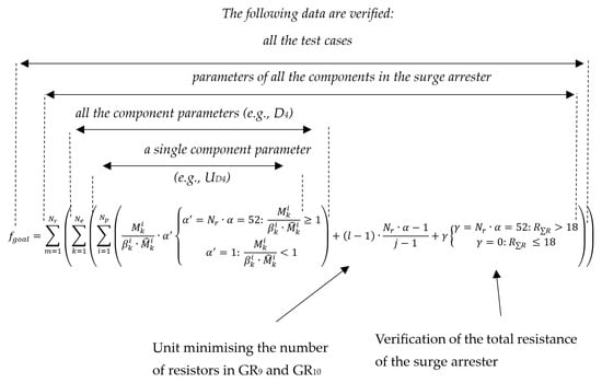 A schematic diagram and a preliminary analysis of GA in terms of the development of a surge arrester module in the railway environment are shown in [], but some modifications are needed. As a result of the new assumptions, the goal functions have been updated with the following components: an additional test case (when a gas discharge tube—GDT is not involved), a part that optimizes the number in the resistor groups, and limiting the total volume of resistance in the surge arrester. The implementation of GA for the new purpose of performing such an analysis is presented below.