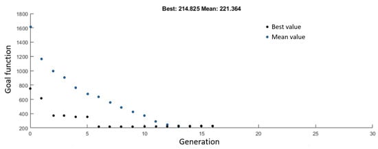 The algorithm was terminated after 851 iterations in less than 21 h due to a lack of expected progress in reducing the goal function. The statistics of the genetic algorithm are shown below in Figure 10.