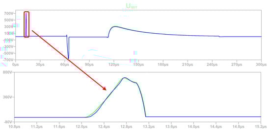 The above values were then contrasted with the time waveforms. Since the differences in the critical parameters of the surge arrester between the degraded and the nominal cable did not exceed 10.09% (Table 6), the voltage waveform of a component with a large amplitude was chosen as an example to visualize the differences. For this purpose, the voltage at the input of the surge arrester (UGDT (t) Figure 6) shown in Figure 11 was used.