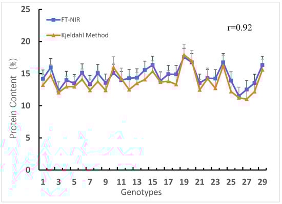 Comparison of protein content of wheat genotypes measured via physicochemical and FT-NIR methods. The positive error line in the figure indicates the degree of data variability, where the black lines is the error lines of FT-NIR and the gray lines is the error line of Kjeldahl Method.