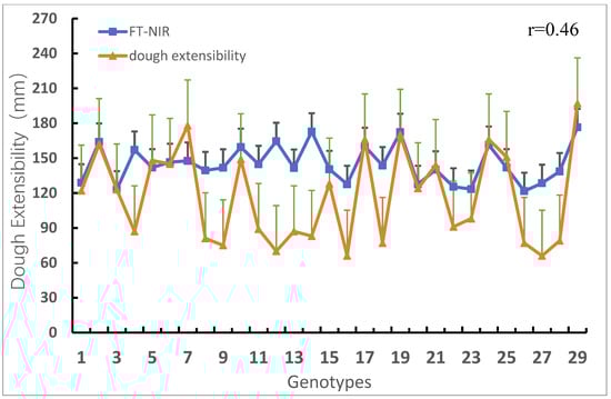 Comparison of dough extensibility of wheat genotypes measured via physicochemical and FT-NIR methods. The positive error line in the figure indicates the degree of data variability, where the black lines is the error lines of FT-NIR and the gray lines is the error line of Dough extensibility.