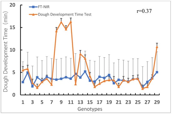 Comparison of dough development time of wheat genotypes measured via physicochemical and FT-NIR methods. The positive error line in the figure indicates the degree of data variability, where the black lines is the error lines of FT-NIR and the gray lines is the error line of Dough Development Time Test.