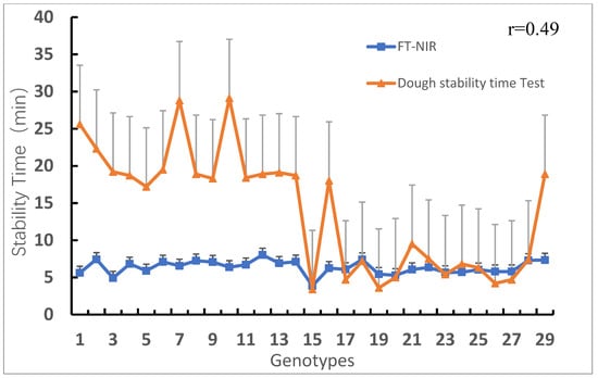 Comparison of stability time of wheat genotypes measured via physicochemical and FT-NIR methods. The positive error line in the figure indicates the degree of data variability, where the black lines is the error lines of FT-NIR and the gray lines is the error line of Dough stability time test.