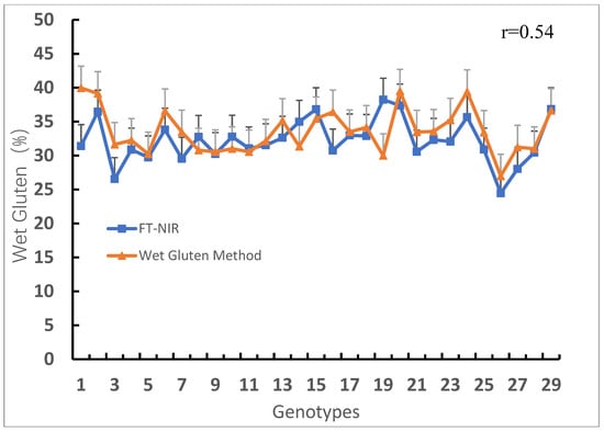 Comparison of wet gluten of wheat genotypes measured via physicochemical and FT-NIR methods. The positive error line in the figure indicates the degree of data variability, where the black lines is the error lines of FT-NIR and the gray lines is the error line of Wet Gluten Method.