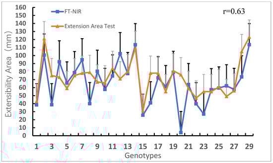 Comparison of extensibility area of wheat genotypes measured via physicochemical and FT-NIR methods. The positive error line in the figure indicates the degree of data variability, where the black lines is the error lines of FT-NIR and the gray lines is the error line of Extension Area Test.