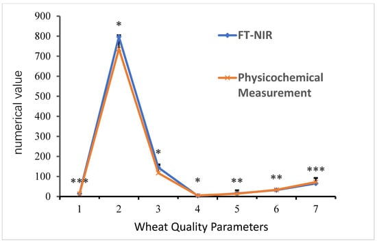 Comparison of different indicators of wheat genotypes measured via physicochemical and FT-NIR methods. ***, **, and * indicate significant at p < 0.001, 0.01 and 0.05, respectively, where the black lines is the error lines of FT-NIR and the gray lines is the error line of Extension Area Test. The positive error line in the figure indicates the degree of data variability: “1” for protein content, “2” for bulk density, “3” for dough extensibility, “4” for development time, “5” for stability time, “6” for wet gluten, and “7” for extension area.